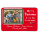 Christmas Card Photo Magnet design features your photo in top left corner against a red background. Photo is framed by a lovely green and white border. Customisable heading reads, "Merry Christmas" in white lettering. Image of a Santa hat is balanced on top of the "C". Wording just below reads, "From the (Family Name). An image of Christmas gifts is pictured below. Giving the design a personal touch, the "Signatures" of the family members are displayed below in a lovely, cursive font.