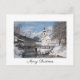 Christmas postcard of a church under a layer of snow next to a mountain stream and a bridge with Alps mountains in the background in a winter landscape in Ramsau bei Berchtesgaden in the Berchtesgadener Land in Bavaria, southern Germany, near the border with Austria with a white border and the text 'Merry Christmas'.
