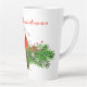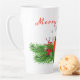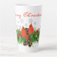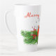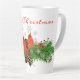This latte mug features a seasonal design that birders will love. Two cardinals are sitting amongst holiday greenery, with pinecones and snowflakes. There are snowflakes in the background and a Christmas greeting.