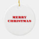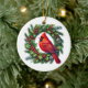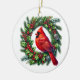 This ceramic Christmas ornament is shown with a festive cardinal on a wreath art print.
