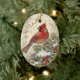 Lovely, vintage picture of a cardinal, sitting on a holly bush, is featured on this ceramic oval ornament for the Holidays. Front of ornament has a picture of the cardinal and back of the ornament reads, "Merry Christmas and Happy New Year", in white lettering on a red background. Use on your tree or give as a gift to cardinal and vintage fans too!