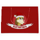 Gift Bag with an illustration of a cute lion with red Santa cap; great decoration for Christmas holidays, editable template design with custom field for your own text, illustrated by Radka Kavalcova
