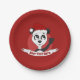 Red Christmas paper plates with illustration of a head of cute panda bear with Santa's hat; great decoration for Christmas holidays, editable template design with custom field for your own text, illustrated by Radka Kavalcova