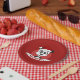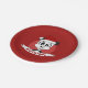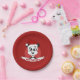 Red Christmas paper plates with illustration of a head of cute panda bear with Santa's hat; great decoration for Christmas holidays, editable template design with custom field for your own text, illustrated by Radka Kavalcova