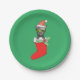 A watercolor painting of a very cute black cat in a Christmas stocking and a Christmas hat. He is looking very friendly at you with his big green eyes.