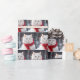 Pretty white cat wearing a red winter scarf in snowflakes with a white border.