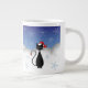 Cute goth style cat in a red christmas santa hat and a christmas bauble on the end of its tail with snowflakes.