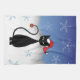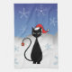 Cute goth style cat in a red christmas santa hat and a christmas bauble on the end of its tail with snowflakes.