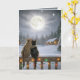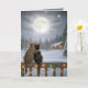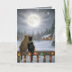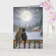A black and tabby cat cuddles on a snowy fence, surrounded by glowing, colorful lights, mesmerized by the shimmering moon