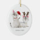 Cute Christmas ornaments with custom names featuring an illustration of two siamese cats wearing a santa hat and antlers. Perfect for cat owners of two.