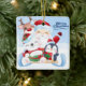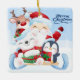 This ceramic Christmas Ornament is shown in a square shape with a festive holiday Santa and friends print.