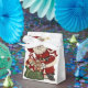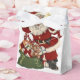 Tent-style with white ribbon favour box with a vintage 1940s image, on the front and back, of jolly Saint Nick with a bag full of toys and carrying a box of Christmas cheer in snowfall. See the entire Holiday Favour Box collection in the PARTY FAVORS section.