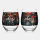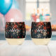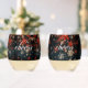 Stemless wine glasses with an cheers in a silver effect. Beautiful red , gold and white snowflakes on black. Add any text you like.