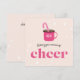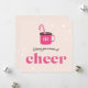 The front of the card features a hot cocoa illustration in red, and the word "cheer" with a starry pattern applied to it.