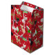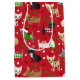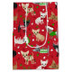Cute Christmas Chihuahua dogs with black, tan, cream, blue and grey coats dressed in festive holiday outfits, Santa hats and argyle sweaters with scattered Christmas ornaments pattern.
