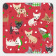 Cute Christmas Chihuahua dogs with black, tan, cream, blue and grey coats dressed in festive holiday outfits, Santa hats and argyle sweaters with scattered Christmas ornaments pattern.