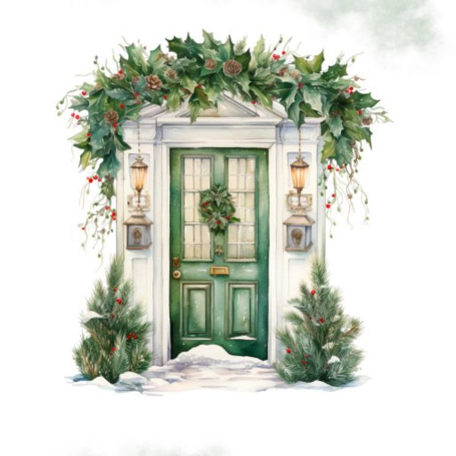 Elegant winter scene of a church door with Holly wreath. Matching invitations and wedding party supplies are available in this collection suite.