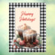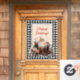 Stylish Holiday window cling for home or business features black and white buffalo plaid border with a duet of festive cocoa cups in watercolor illustration and customisable red "Happy Holidays" text