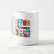 A colourful coffee cup adorned with cheerful Christmas sayings and holiday decorations.