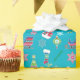 Fun christmas wrap for all ages! Images on a sky blue background include a patterned stocking, a snowman, a sleigh, a holiday tree, a tree ornament, a gold bell, several different snowflake images, and the text in green Ho ho ho! Cute, and festive for the Holiday season.