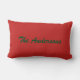 Get festive with this red and green abstract pattern pillow. The front of the pillow features an artistic pattern of holiday colours perfect for Christmas. The back features a bright red background with your family name in green font. Quickly and easily personalise the text. The solid colours on the back can also be customised if you desire.
