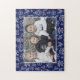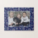 This pretty family photo puzzle includes your horizontal picture with a Christmas-themed constellation pattern surrounding it. The blue-and-white geometric pattern includes Santa Claus, bells, snowmen, gift boxes, trees, and more. Use the template to add your photo.