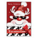 Ho, Ho, Ho, a fun Christmas card for Cousin illustrated in red, white and black. Against a red background, the quirky face of a white reindeer wearing a Santa hat and dark sunglasses smile out at you. Part of his face is hidden behind a large present wrapped in a big red bow.