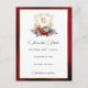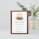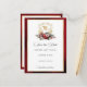 Timeless and elegant yet festive holiday-themed wedding save the date design featuring classic hand-drawn gold floral crest accented by a colourful spray of red and white Christmas flowers and evergreens. This custom formal template includes editable text fields as well as custom calligraphy text graphics and a gold textured border. Back features additional text fields and complementary Christmas floral graphic.
