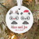 Christmas ornament with 2 cute pandas wearing up santa hat and Rudolph red nose reindeer. It comes personalized with your names and date.