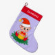 Cute Christmas elf sitting on a pine branch on periwinkle Stocking. Elf design is only on the front side. Name ready to be personalised.