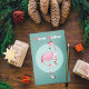 Cute and funny pink flamingo in striped socks scarf and Santa hat pink and mint pastel colours illustration. Striped letters supplement this design