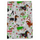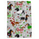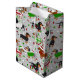 Cute Christmas dachshund dogs with black, tan and dapple coats dressed in festive holiday outfits, Santa hats and argyle sweaters with scattered Christmas ornaments pattern.