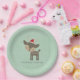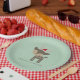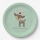 A cute and festive set of paper plates with a hipster minimalist feel. Charming illustration of a brown woodland deer wearing a red santa hat - hipster style. Set on a retro green background. Customisable text says Christmas Greetings.