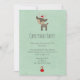 A cute and festive holiday Christmas party invitation with a hipster minimalist feel. At the top of the invite is a charming illustration of a brown woodland deer wearing a red santa hat - hipster style. Personalise with your party details. A little red Christmas decoration is at the bottom. Set on a retro green background.