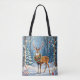 A really sweet holiday tote bag with a festive deer standing in a festive winter wonderland enchanted forest decorated in Christmas fun! Fill it with gifts and use it as a reusable gift bag!