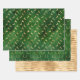 This holiday wrapping paper assortment features patterns of gold faux foil antlers and leaping deer on green distressed backgrounds, along with a gold faux foil satin stripe pattern.