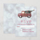 An RSVP card with a cute christmas design. Image is a cute little toy truck with Merry Christmas hand painted on the side with gold lettering. Carrying a decorated Christmas tree in the back. The background is a silver bokeh pattern.