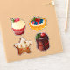 This charming and colourful illustration set features four classic Christmas sweets. The individual graphics include a Red Velvet Cupcake with a raspberry, a Fruit Tart topped with berries, a smiling Gingerbread Star cookie, and a mini Chocolate Christmas Pudding Cake. These vibrant, detailed graphics are perfect for creating holiday sticker sheets, gift tags, baking party invitations, or any product celebrating Christmas treats and sweets.