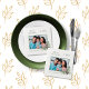 Personalise and add your own family photo. A green frame decorated with a cone and pine greenery. Elegant white background. Add your family name and year.