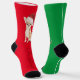 One sock has a red background and the other a green background in the traditional Christmas colours.