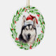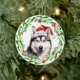 Holiday Christmas tree ornament with a watercolor Siberian Husky and watercolor Christmas wreath design. Add the dogs name to the design and it's the perfect gift idea for that dog lover you know, or yourself!