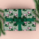 Christmas wrapping paper featuring Cute Frenchie dog with knitted green overall, pink Santa's cap and text `Merry Christmas´ on a Soft green background.
