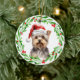 Holiday Christmas tree ornament with a watercolor Yorkshire Terrier and watercolor Christmas wreath design. Add the dogs name to the design and it's the perfect gift idea for that Yorkie lover you know, or yourself!