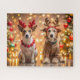 Two large dogs dressed as reindeer pose near a Christmas tree. The background has a bokeh effect.
