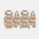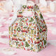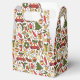 A lively Christmas doodle pattern filled with charming holiday icons including snowmen, gifts, red cars, stockings, mittens, candles, holly leaves, gingerbread cookies, stars, mugs, bells, and Christmas trees. The bright red, green, and gold palette makes this favor box perfect for festive parties, gifts, and winter celebrations.