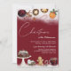 A Christmas party or dinner party invitation. On a festive red background with snow, Christmas foods such as mulled wine, mince pies, ginger bread, Christmas cake and candy canes are displayed.