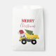 A cute illustration of a Christmas dump truck construction truck vehicle wearing a Santa hat and decorated in Christmas lights with words "Merry Christmas" transporting a festive Christmas tree. Perfect for boys and girls who love construction trucks, toy trucks or heavy machinery. An ideal Christmas favour bag for dump truck enthusiasts big or small, girls or boys.