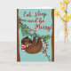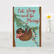 This is a Christmas card with a sloth hanging on a pine branch wearing a striped red and white scarf. Christmas lights are strung across the branch and the text says ‘eat, sleep and be merry!’