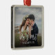This design features a Christmas holiday photo married couple, Mr. and Mrs. wedding elegant, just married picture photography, minimalist minimal typography template, a trendy stylish calligraphy script font, a Christmas holiday home décor tree, a wedding day marry bride groom, a Christmas wedding photo ornament, a simplistic elegant whimsical script, photo wedding couple gift idea