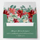 Inspirational Christmas green envelope depicts an elegant watercolor floral design with red and pink Poinsettias, Eucalyptus greenery, and berries. It features return address and Bible Verse Luke 2:14, "Glory to God in the highest, and on earth peace, good will towards men." All text can be customised or deleted.